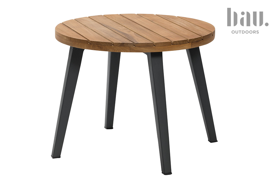Featuring the same clean-lined design as the Tivoli coffee table, this contemporary outdoor side table combines a powder-coated anthracite aluminium base with a slatted round top in plantation teak. The dark grey finish pairs seamlessly with modern bifold doors and aluminium window frames, while the natural teak surface adds a touch of organic warmth.