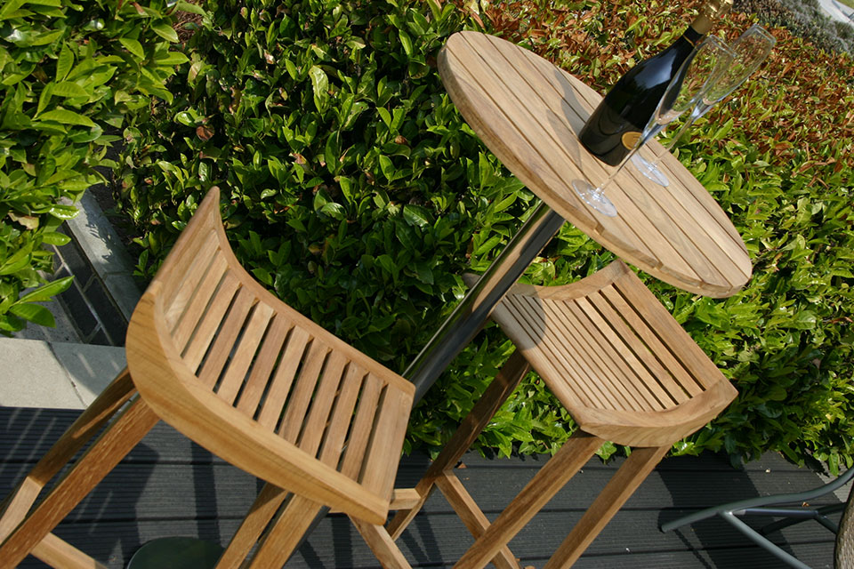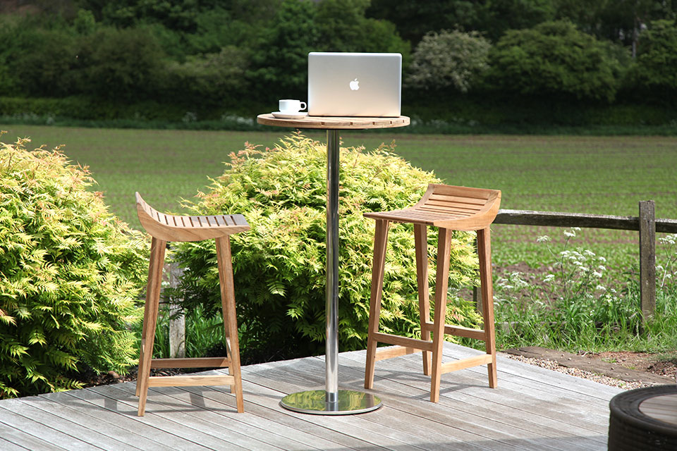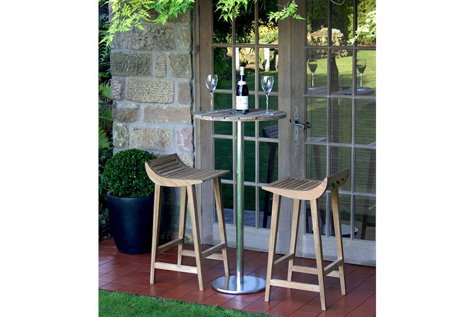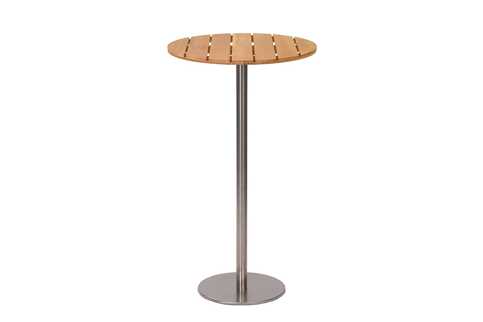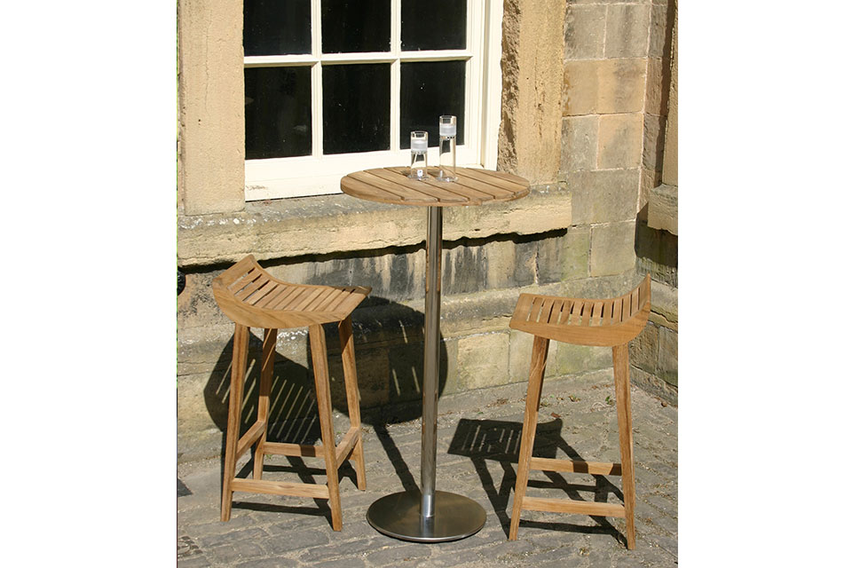 The bar table stands at 115 cm and is made up of a solid teak top and a stainless steel base, so can be left outdoors without any maintenance.