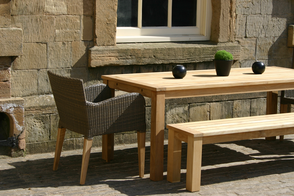 Matching Antibes garden benches are available for the both rectangular outdoor dining tables and complement the design perfectly.
