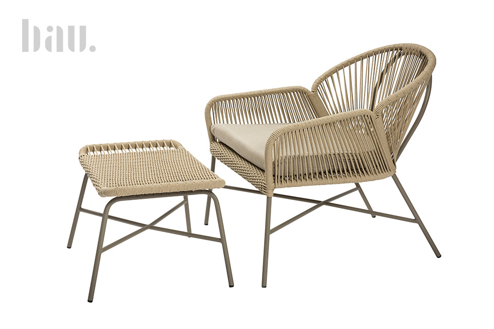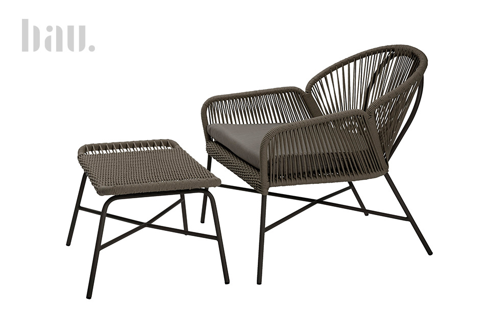 Designed for lounging, the Cord Outdoor Armchair offers a generous seat with ergonomic support and comes with a matching footstool for full-body relaxation. The plush cushions are finished in Olefin fabric, known for its resistance to water, stains, fading, and mildew — ideal for long-term outdoor use.